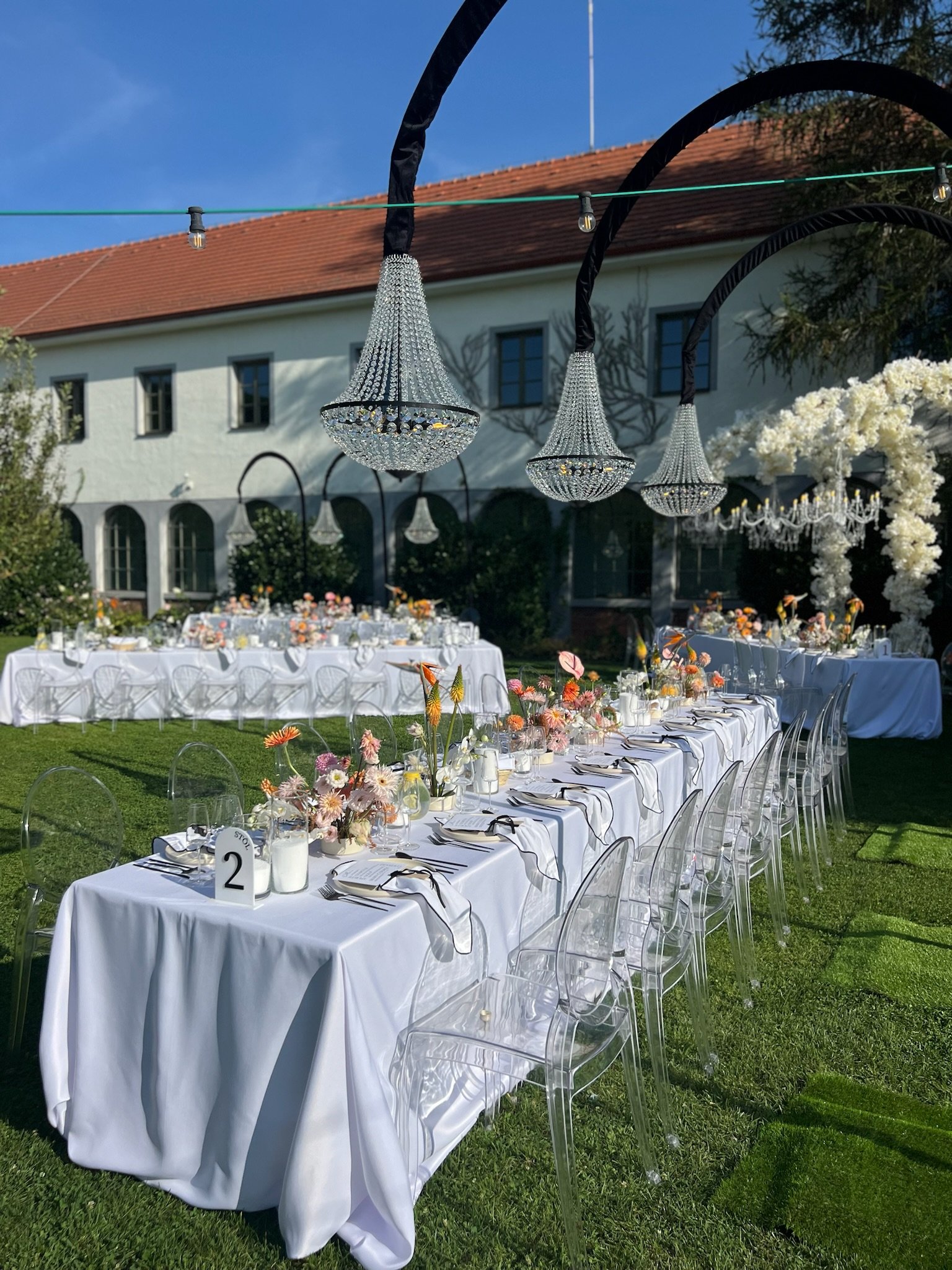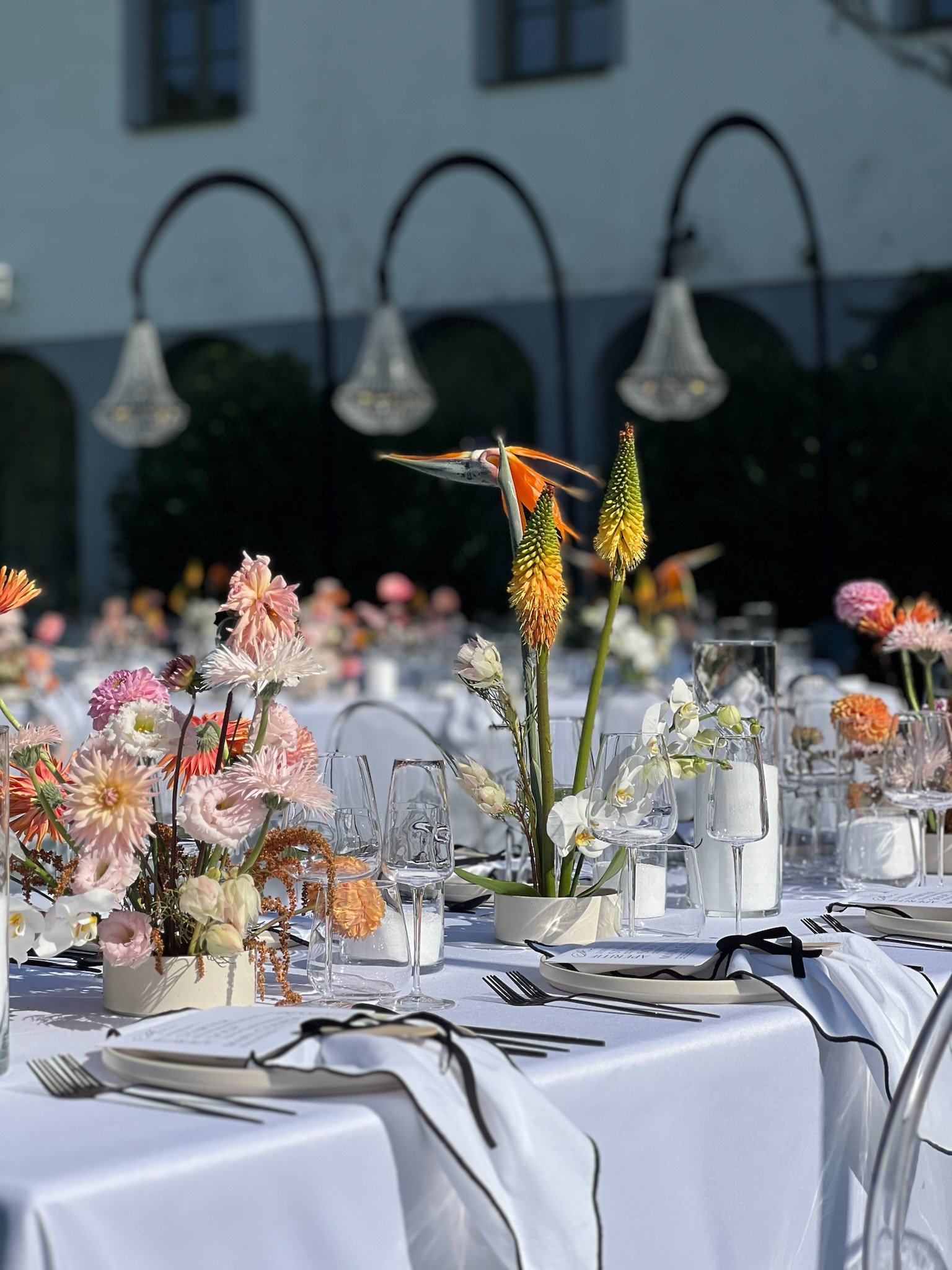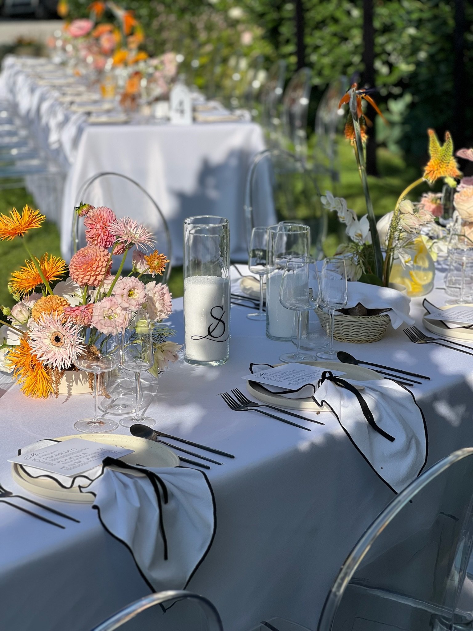 Kontrast čiernobielej elegancie a kvetinových aranžmánov v pestrých farbách vytvára moderný svadobný koncept.