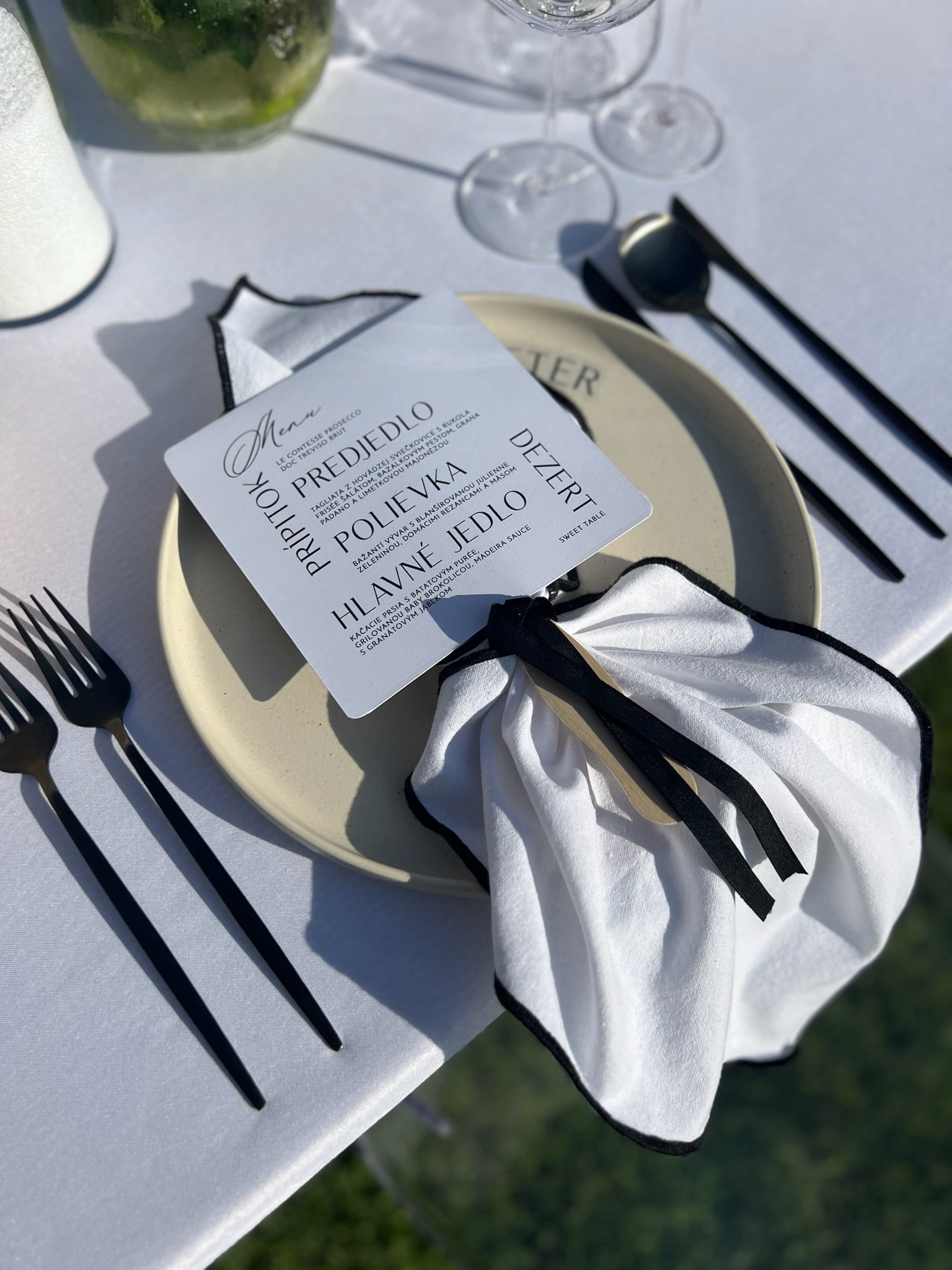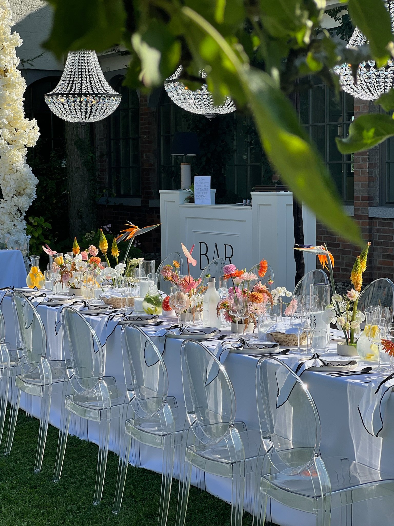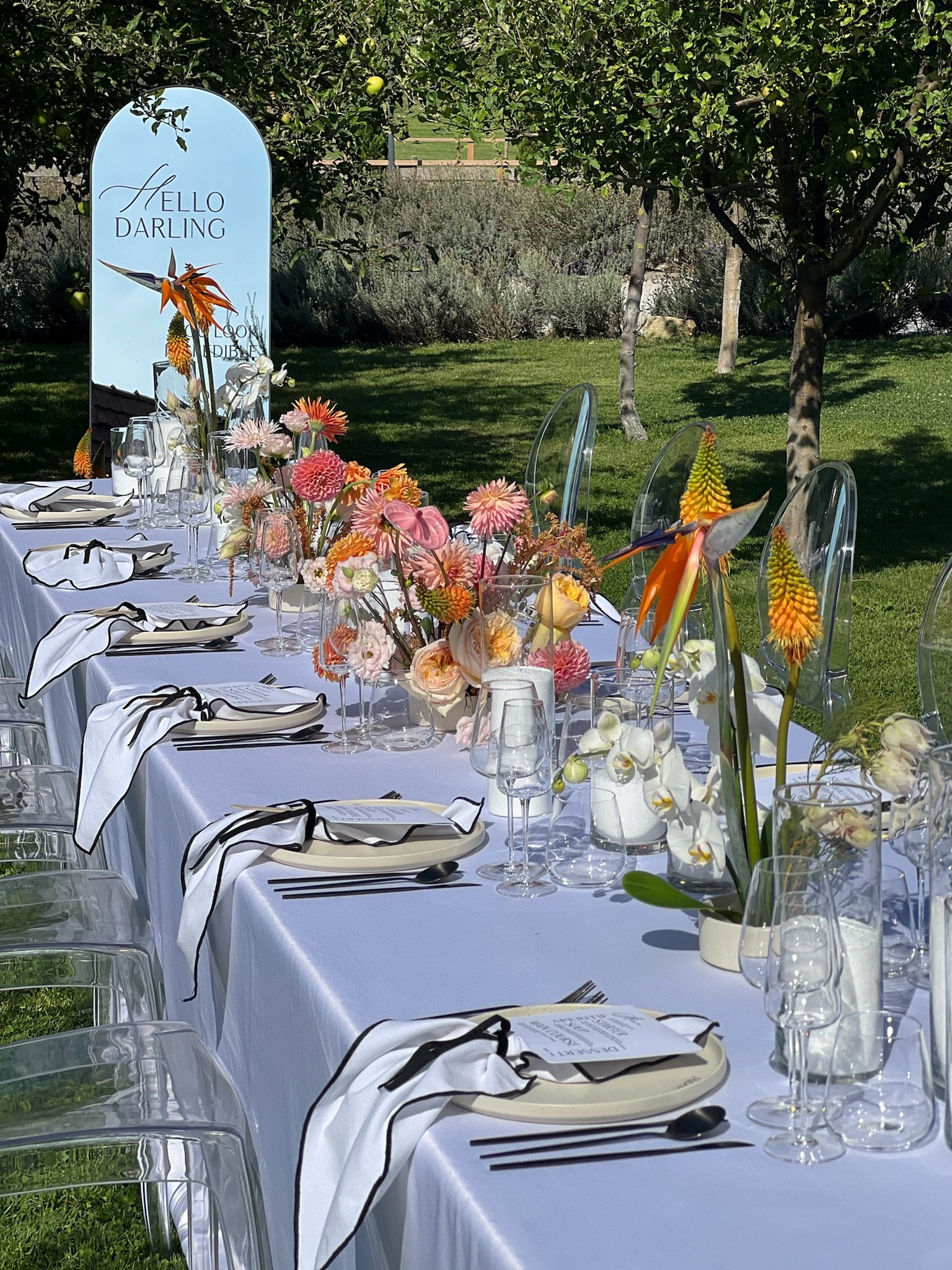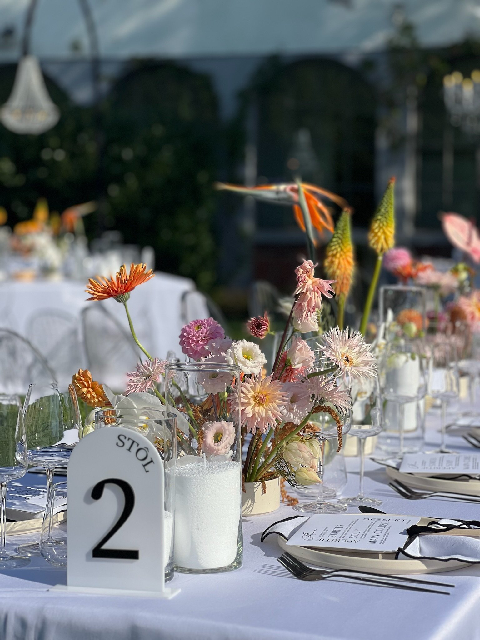 Kontrast čiernobielej elegancie a kvetinových aranžmánov v pestrých farbách vytvára moderný svadobný koncept.